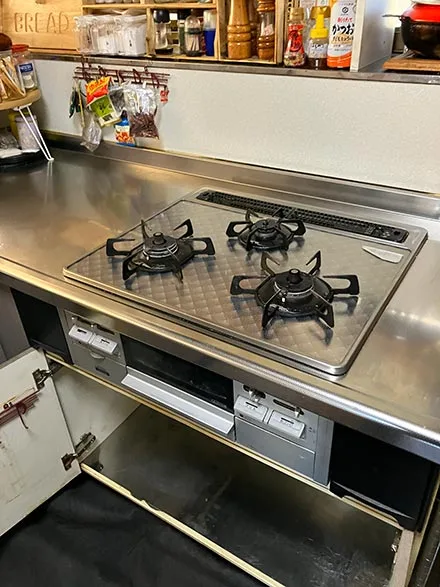 既存の開口寸法に合わせて丁寧に据え付けを行い、ガス接続や天板の水平調整も確認しながら安全に施工を進めました。