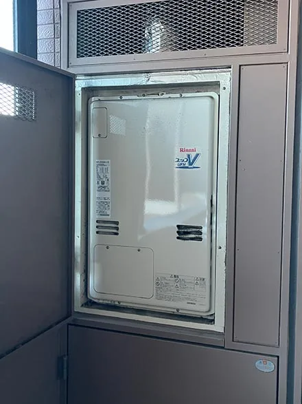 埼玉県戸田市新曽にて、リンナイ製給湯暖房用熱源機RUFH-V2403AU2-3(B)をRUFH-A2400AU2-3(A)へ交換しました。PS設置・上方排気タイプの24号フルオートモデルで、集合住宅向けの後継機種となります。