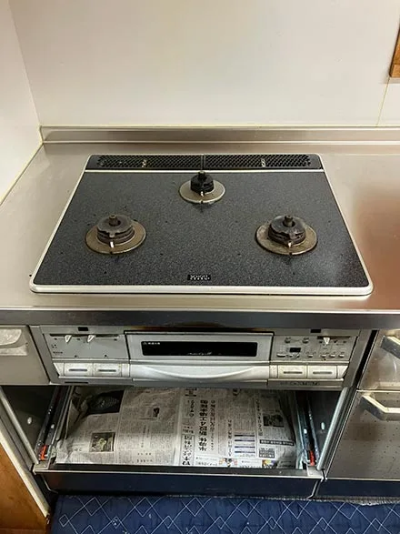 既存コンロを撤去後、設置スペースやガス接続部の状態を確認しながら新しいコンロを設置。固定状態や接続部の安全確認を行い、安心してご使用いただけるよう丁寧に施工しております。