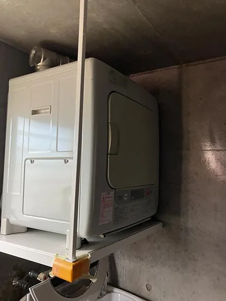 既存の設置状況や接続部を確認しながら本体を撤去し、新しい乾燥機を設置。コンパクトな機種のため、設置スペースに無理のない収まりとなるよう丁寧に施工しております。