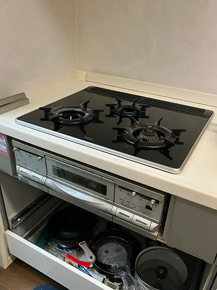 埼玉県さいたま市北区盆栽町にて、既設ビルトインコンロRBG-N31W5GA1Xから、パロマ製ビルトインコンロ「リプラ」PD-509WS-60CV(ティアラシルバー)への交換工事を行いました。